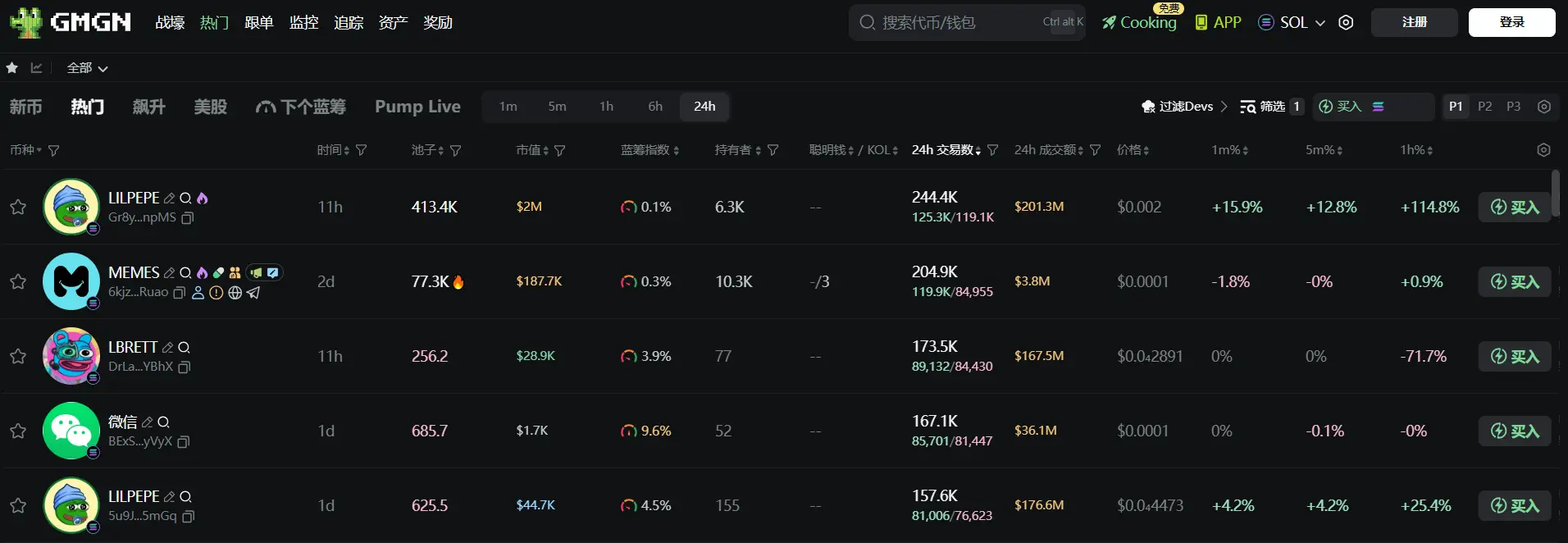 过去 24h Solana 热门代币前五依次为:LILPEPE、MEMES、LBRETT、微信、LILPEPE