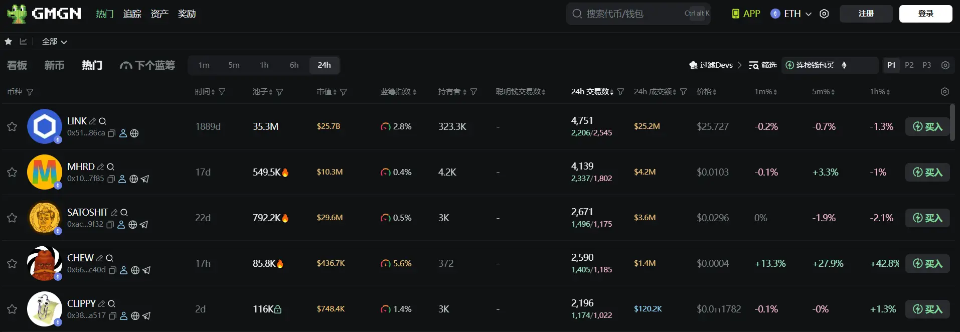 过去 24h 以太坊热门代币前五依次为:LINK、MHRD、SATOSHIT、CHEW、CLIPPY