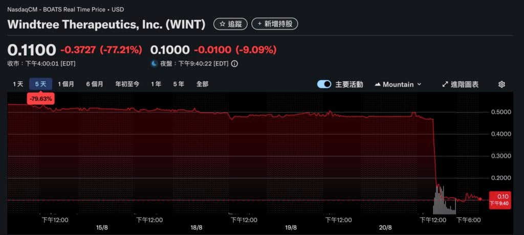 消息虽一度推高股价至 1.28 美元,但 WINT 长期亏损,商业化遥遥无期,无法以稳定营运现金流支持市值。把大量资金暴露在高波动加密资产,更让市场怀疑此举是否只为短期炒作。随后𧹒盘退潮,WINT 股价一路滑落,短短一个月跌幅超 90%,投资人信心乾涸。