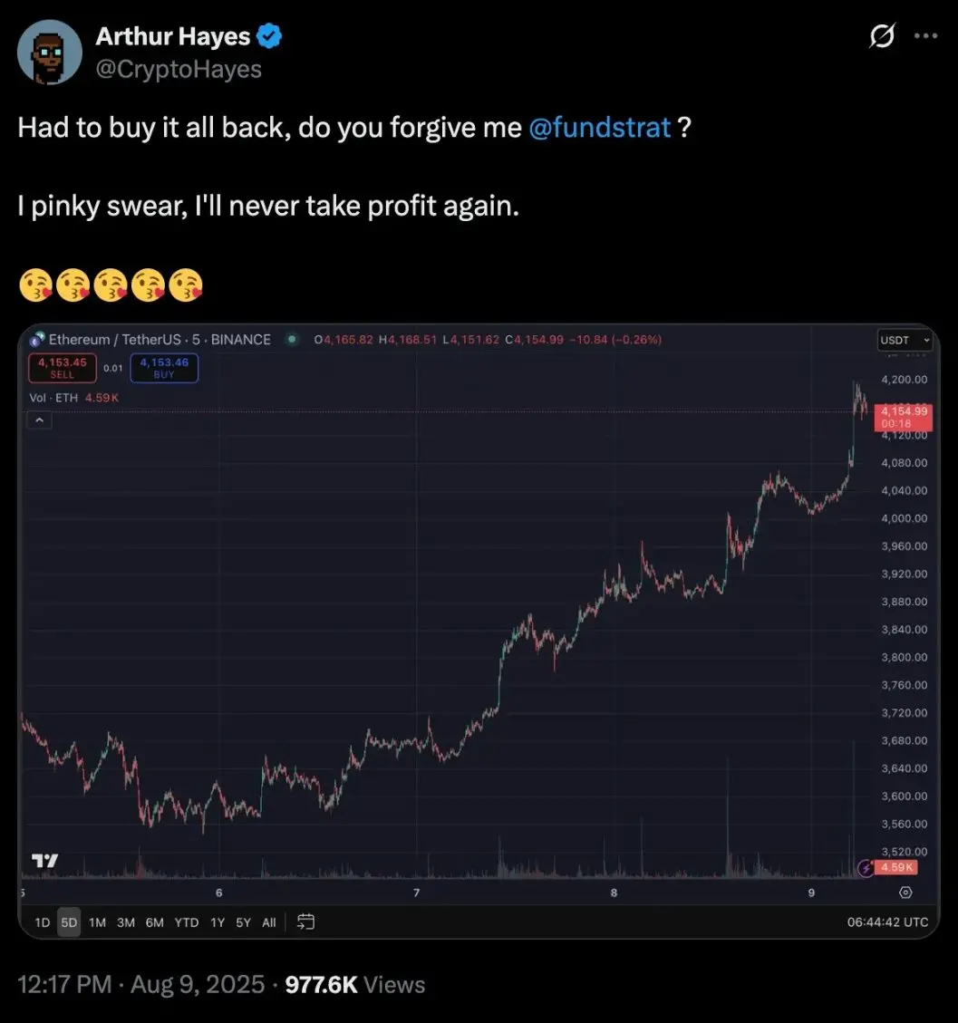 当月早些时候,他因对宏观经济的担忧,以近 3500 美元的价格卖出价值 832 万美元的以太坊。但当以太坊回升至 4150 美元以上时,他又买回了所有仓位,并在社交媒体坦言:「不得不全买回来。我发誓,再也不获利了结了。」