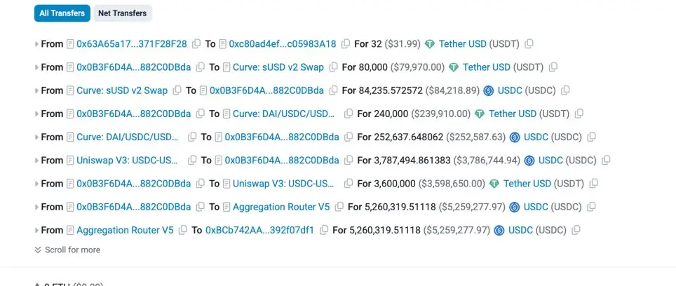 但是,那些持有 SVB 股票的投资者们,只能在每个晚上眼睁睁看着账户里的市值蒸发,反应快的可能会在周四的早上认亏脱手,反应慢的则被迫归零。而$USDC的持有者完全不同,就在SVB关停闭市的周末,web3的人们正在四处通过AAVE,Curve等平台进行疯狂套利。比如,一个钱包地址就在这期间通过USDT换USDC/DAI的价差,成功赚取了1650万美金。哦对,是孙哥的钱包。