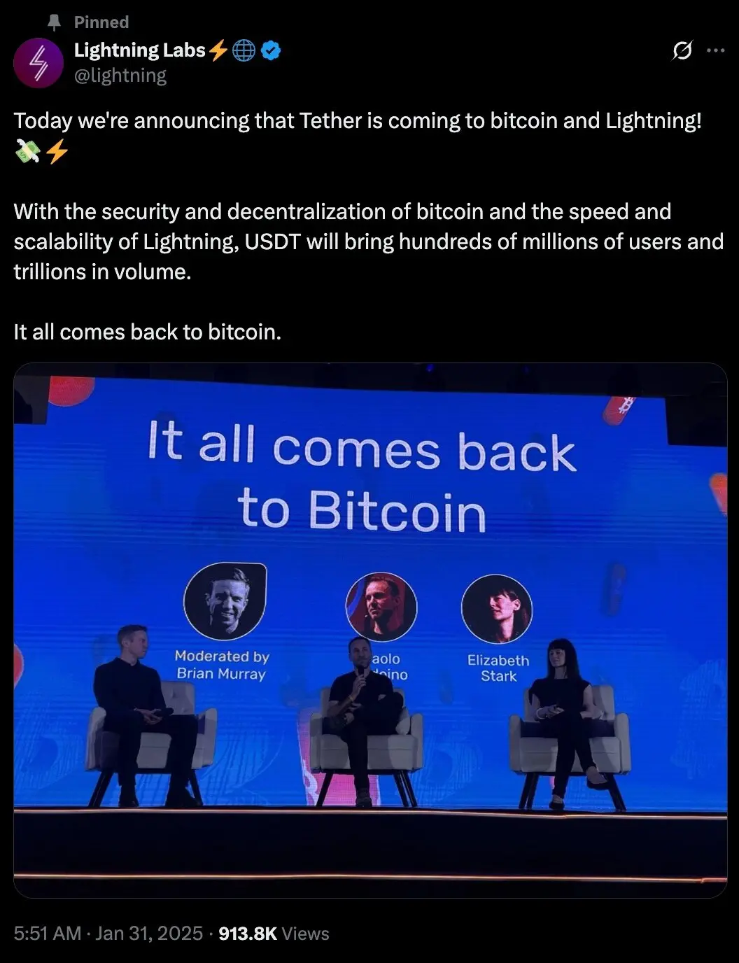 今年 Q1,USDT 背后的 Tether 公司宣布将通过 TA 协议发行 USDT 进入闪电网络生态,意味着 Tether 对闪电网络的认可。