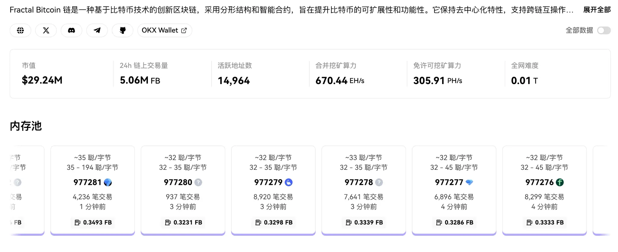 Fractal Bitcoin 当前已初具规模,市值约 2012 万美元,日交易量达 1.43 M FB,活跃地址超过 176 万。其合并挖矿算力达 648.13 EH/s。挖矿难度 0.01 t,尚在早期。