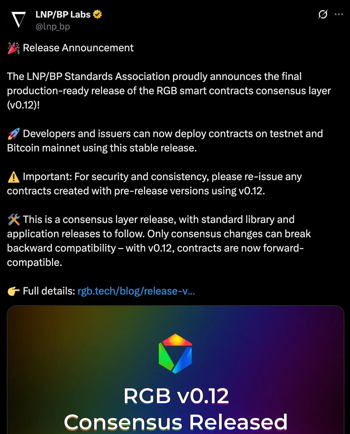 在 2025 年 8 月 7 日凌晨,预热 2 年之久的 BTC 扩展方案 RGB 协议终于上线 BTC 主网。