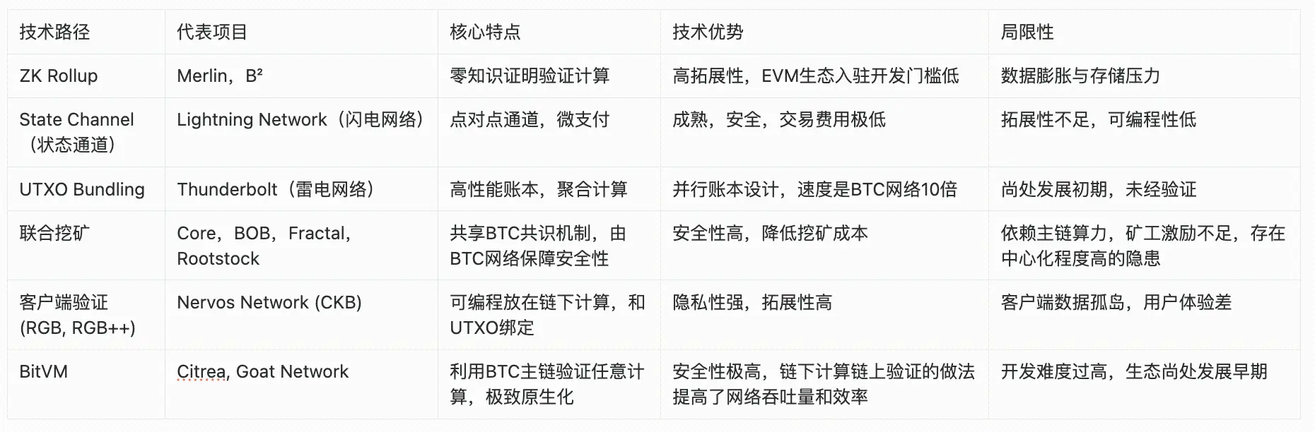 BTC L 2 的不同技术路径对比,数据来源: https://worried-eagle-e5b.notion.site/BTC-21b34b2a8d7a80cb83c1d0021e3a5696