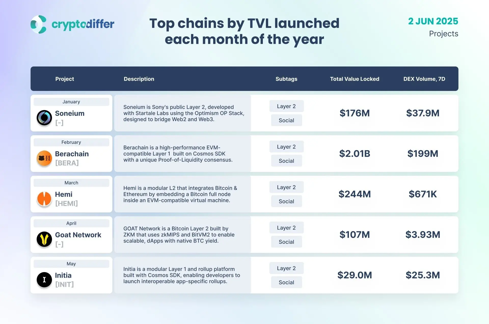 Top chains by TVL launched each month of the year, CryptoDiffier; 数据来源: https://x.com/GOATRollup/status/1929596963286114614