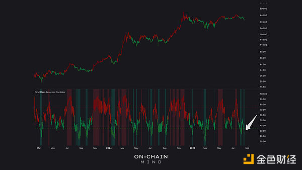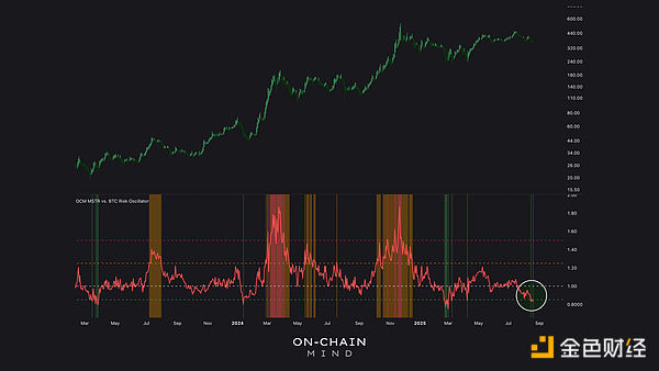 以比特币定价的 MSTR 投资机会:以比特币定价时,MSTR 的风险振盪指标处于最低值之一,这对低税率环境中的投资者而言,这是将投资从比特币转向 MSTR 的强烈讯号。从历史来看,MSTR 股价相对于比特币的这种滞后情况通常会迅速得到弥补。