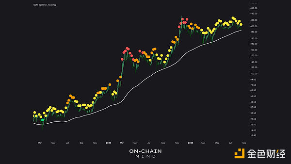 200 日缐图讯号显示强势:MSTR 有望在本轮周期中第二次在 200 日缐图上呈现绿色讯号点,其交易价格处于 200 日均缐 353 美元处。这一水平对多头而言是关键支撑位,标誌著此轮涨势的𫔭始。若能在此价位企稳,可能预示著强劲的上涨潜力。