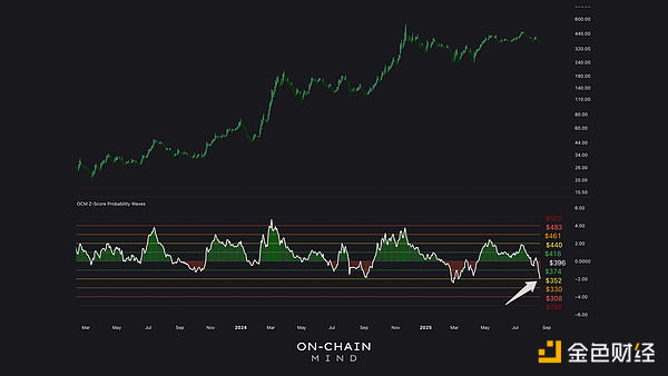 Z 分数机率波:MSTR 的股价已跌至负 2 个标準差水平,也恰好是 353 美元。从历史来看,在这轮牛市中,股价跌至负 1 个标準差以下往往预示著价格会出现大幅波动,如果宏观形势依然乐观,那麽股价很有可能会回归均值。