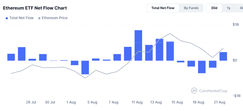 不过以太坊现货 ETF 却在连续 4 日净流出之后,8 月 21 日再度转为净流入 2.8761 亿美元资金。目前总净流入为 120.9 亿美元。不难看出,市场或许在为更高回报而下注以太坊。