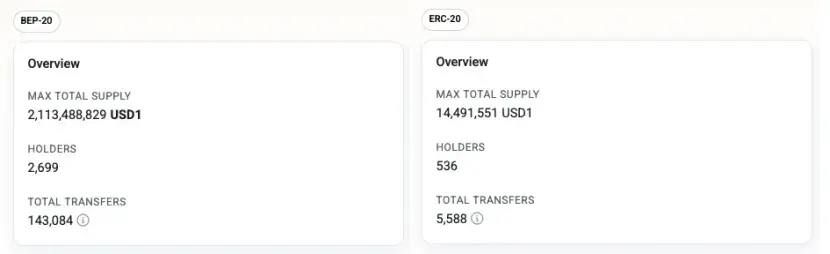 (图 2:BNB 链(BEP-20)与以太坊(ERC-20)上的 USD1 对比。来源:BscScan、Etherscan)