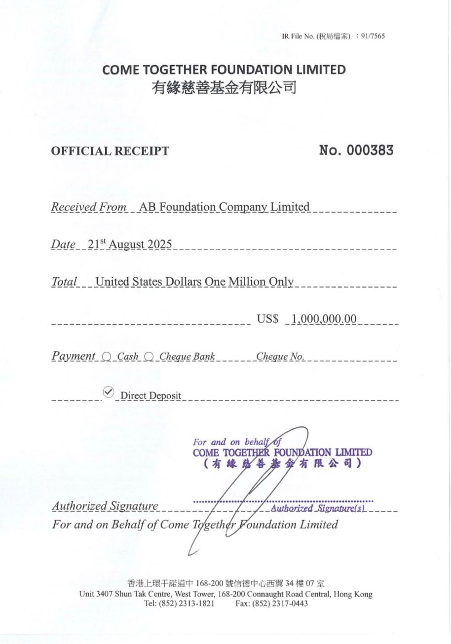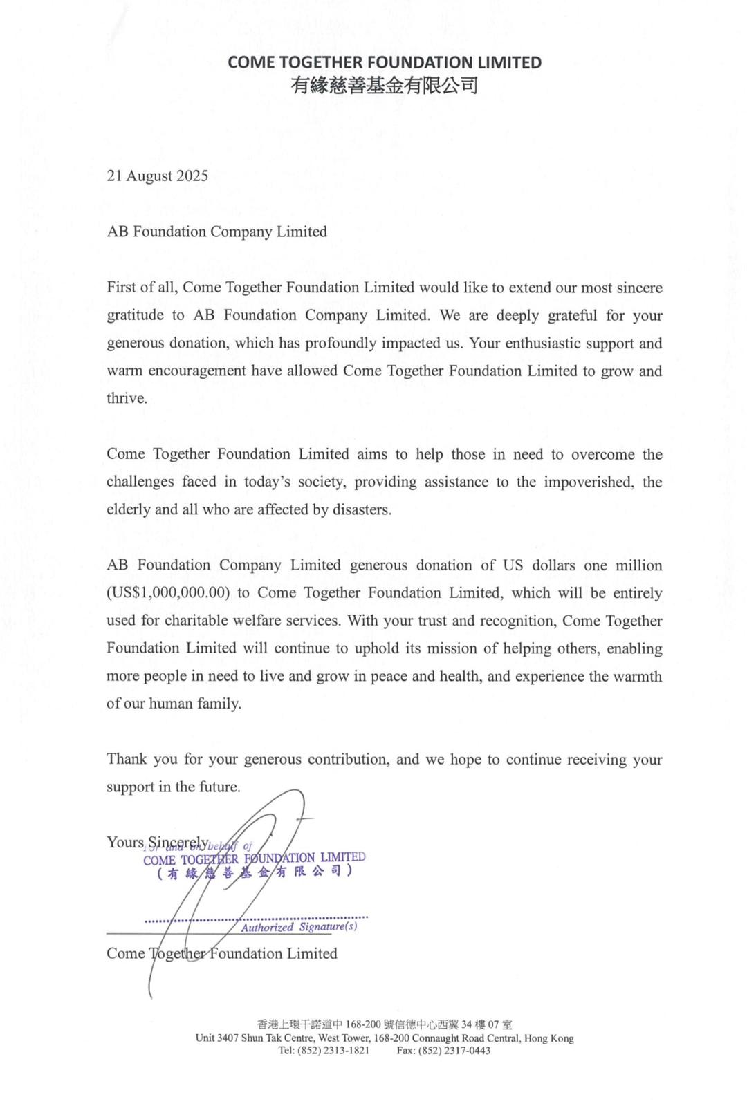 2025年8月21日,AB 慈善基金会(AB Foundation)正式宣布,已向由国际著名演员李连杰(Jet Li)先生创立的有缘慈善基金会(Come Together Foundation) 捐赠 1,000,000 美元,以支持其公益事业。