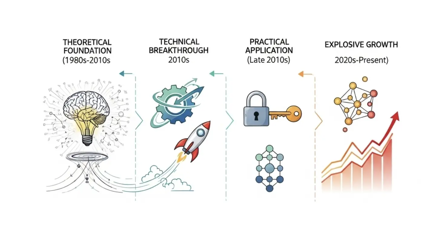 零知识证明(ZK)技术的发展并非一蹴而就,而是经历了长达数十年的理论积累与工程探索。整体可以划分为以下几个关键阶段: