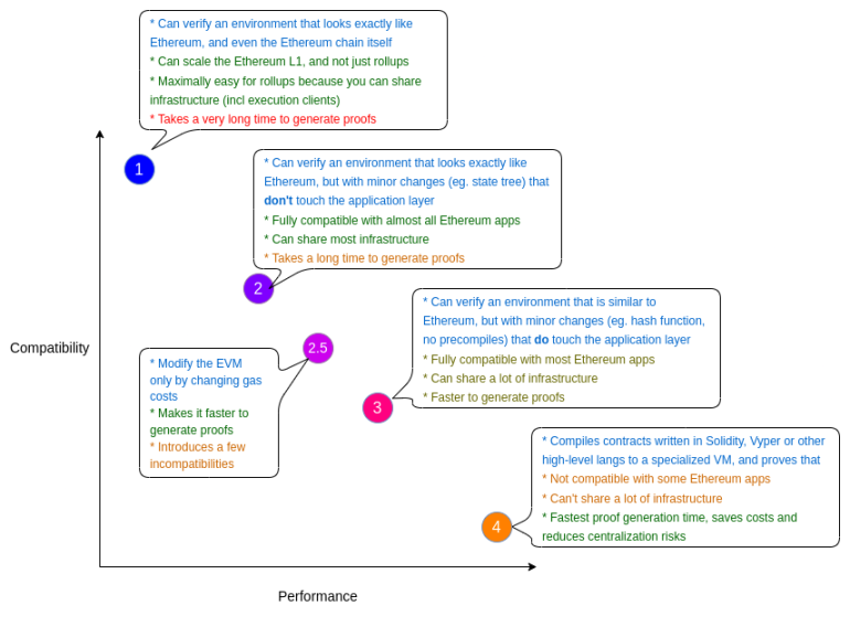 以太坊创始人 Vitalik 在 2022 年提出的 ZK-EVM 四类分类(Type 1–4),揭示了 兼容性与性能之间的权衡: