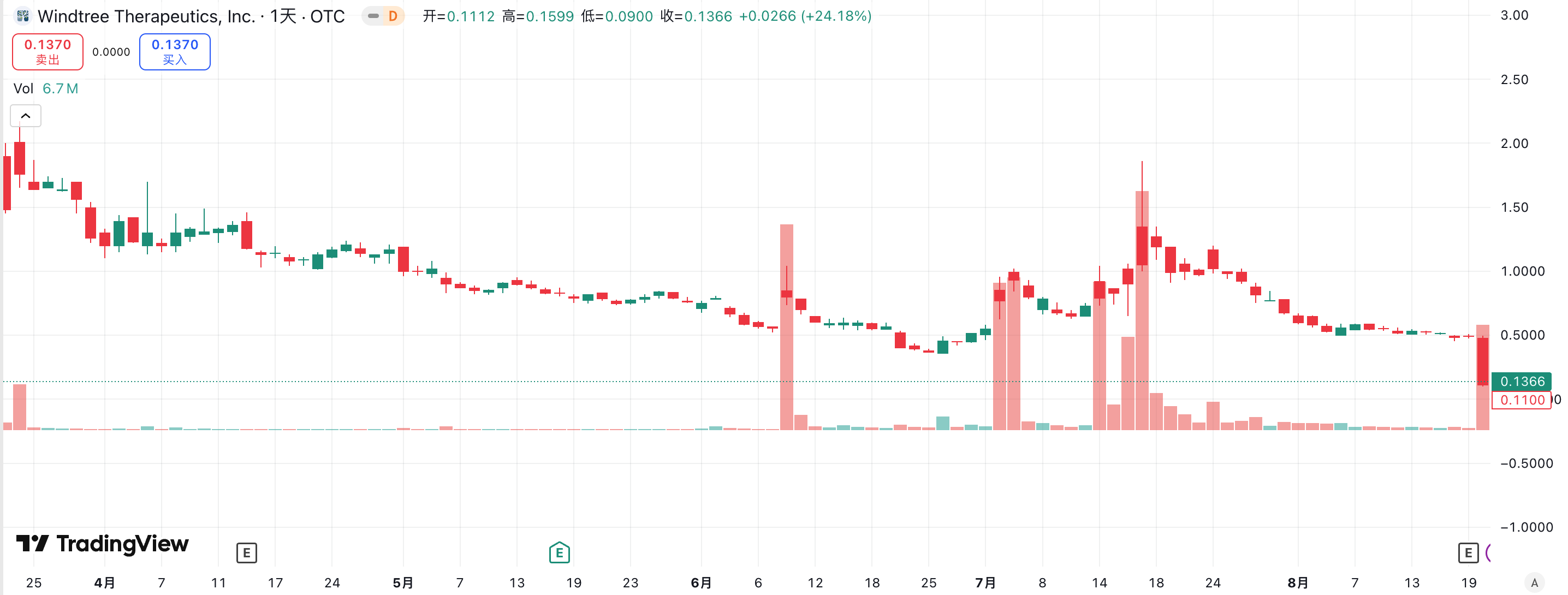 Windtree Therapeutics(WINT)在 7 月高调宣布建立 BNB 战略储备,却因基本面羸弱和股价持续低迷,最终在 8 月 19 日收到纳斯达克退市通知。消息公布后,WINT 股价连续暴跌,单日重挫 77.21%,现价仅剩 0.13 美元,较消息公布后的 1.58 美元累计跌幅高达 91.7%。对于一家本就处于临床阶段、尚未实现商业化、季度亏损不断扩大的小型生物制药企业来说,退市几乎意味着被市场彻底边缘化。
