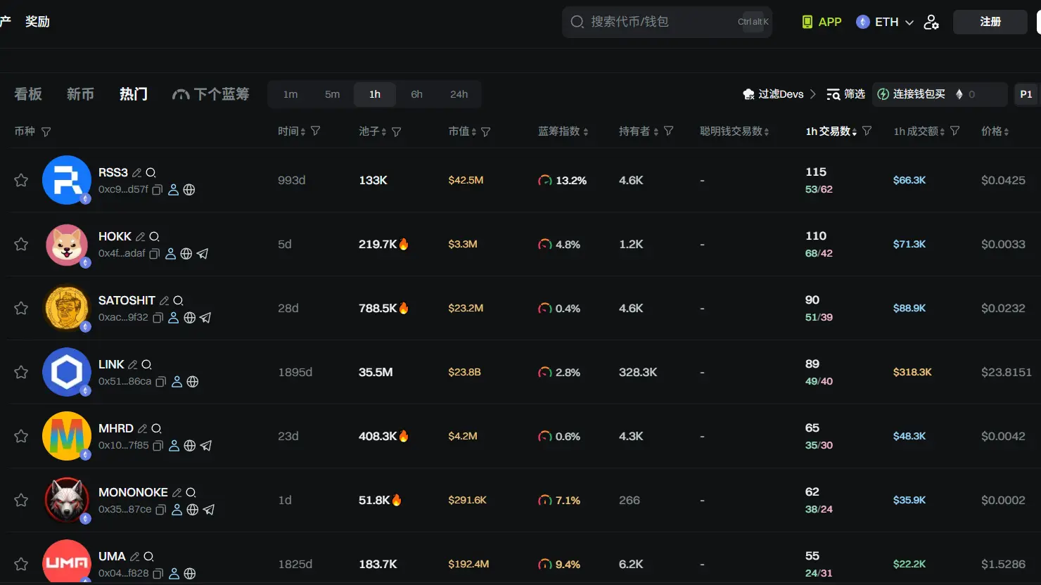 过去 24h 以太坊热门代币前五依次为:RSS3、HOKK、SATOSHIT、LINK、MHRD