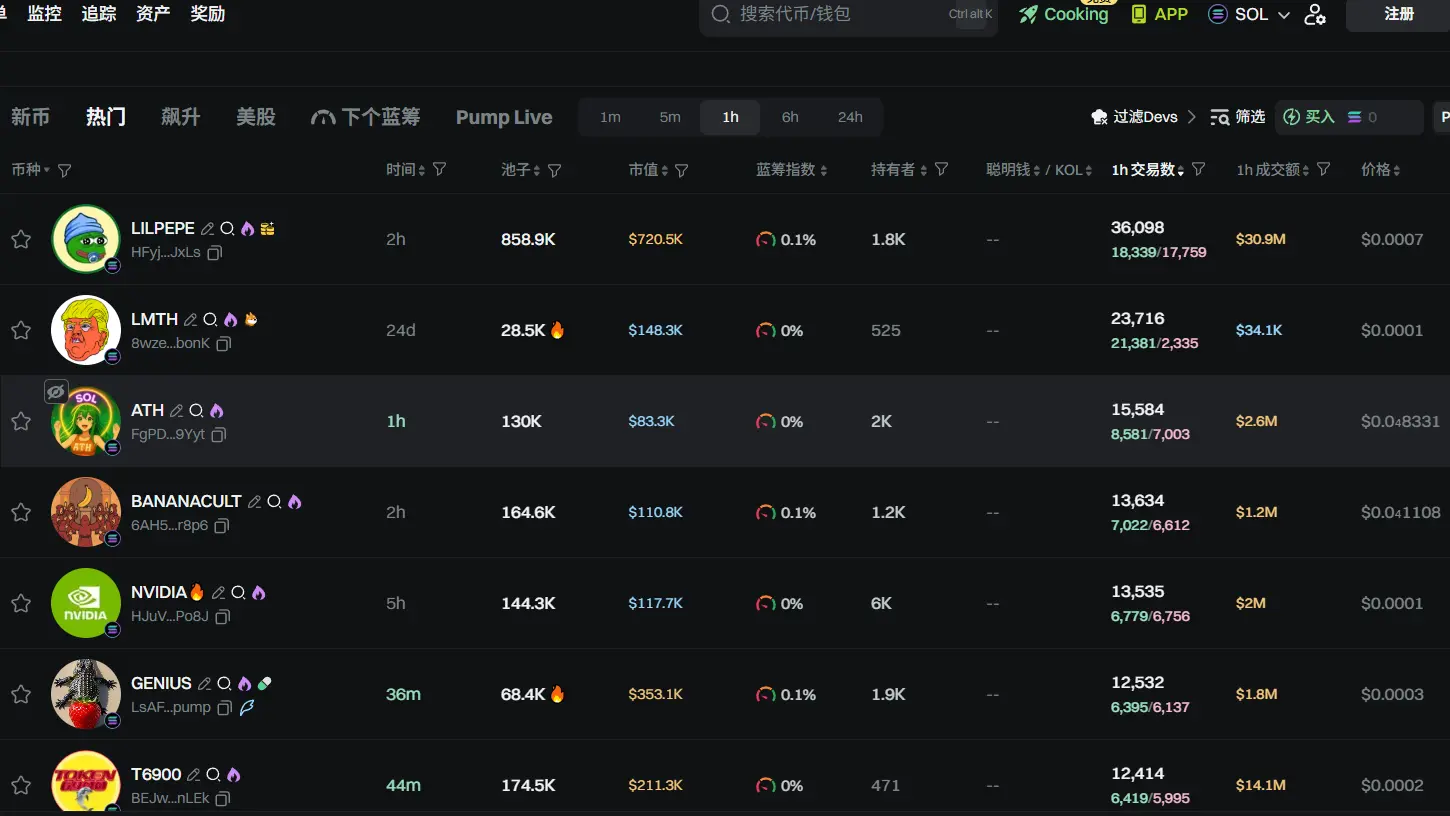 过去 24h Solana 热门代币前五依次为:LIPEPE、LMTH、ATH、BANANACULT、NVIDIA