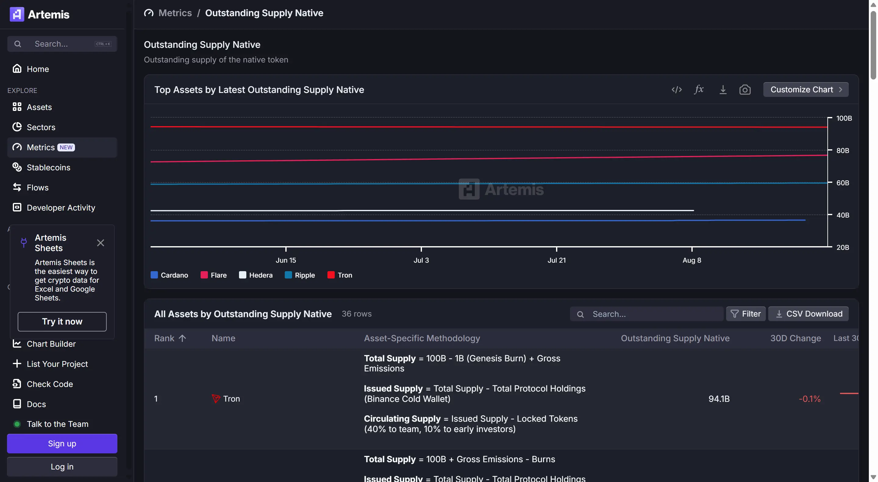 目前,加密数据提供商对同一代币显示的供应量指标存在巨大差异,这会严重影响市值或估值倍数(如市值/收入比率)的计算。Artemis 与 Pantera Capital 联合提出名为"流通供应量"的简易框架,其计算方式为总供应量减去协议总持有量。该模式类似于股市中的"流通股"概念(即总发行股数减去库存股)。我们的目标是让投资者在进行估值比较时,能够更清晰地对代币和股票进行同类对比。