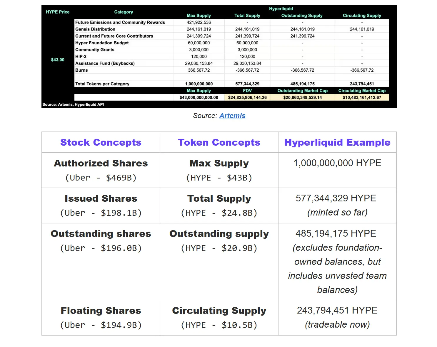 因此,Hyperliquid 的流通供应量估值(约 208 亿美元)最接近真实市值。这类似于股市中的流通股概念——排除库存股后所有投资者实际持有的代币总量。