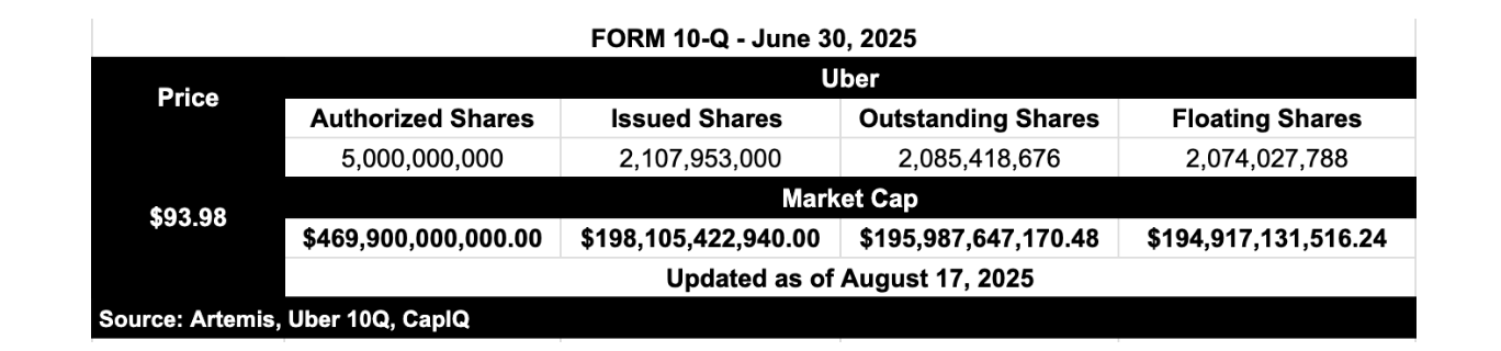 现实中,投资者基于流通股数(约 20.9 亿股)对 Uber 进行估值。截至 2025 年 8 月 17 日,其市值约为 1959 亿美元,预期市盈率为 30 倍。流通股数真实反映了公司价值的经济所有权分布。