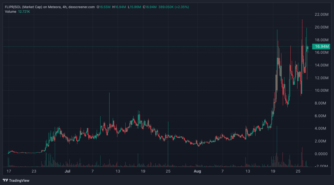 从 今年 6 月底到 8 月下旬,Flipr 的价格表现堪称黑马。两个月前,它的市值还不足 200 万美元,几乎乏人问津。截至 8 月 27 日,该专案的市值已经攀升至最高 2100 万美元,涨幅超过百倍,仅 8 月就上涨 16 倍。