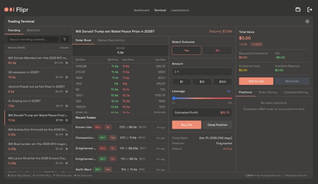 用户只需在 X 上标记 @fliprbot,或者在私讯中输入一句自然语言指令,例如「Will Donald Trump win Nobel Peace Prize in 2025?」,并写上下注方向和金额,就能直接完成交易。下注资讯随即以内容的形式出现在时间轴上,成为可以被他人複製、转发、质疑的社群事件。Flipr 本质上把交易和发文融为一体,让每一次下注都带有公𫔭可见的属性。