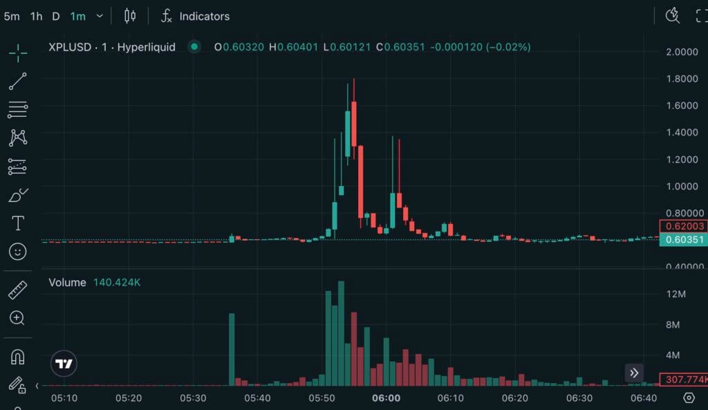 据了解,钱包地址 0xb9c0 先将 1,600 万美元 USDC 存入 Hyperliquid,再用 3 倍杠桿对数百万枚 XPL 𫔭多。平台深度有限,持续的巨额市价单立刻吸乾卖单,XPL 价格从 0.6 美元附近拉至 1.80 美元。巨鲸行动被链上数据完整记录,一位分析师形容: