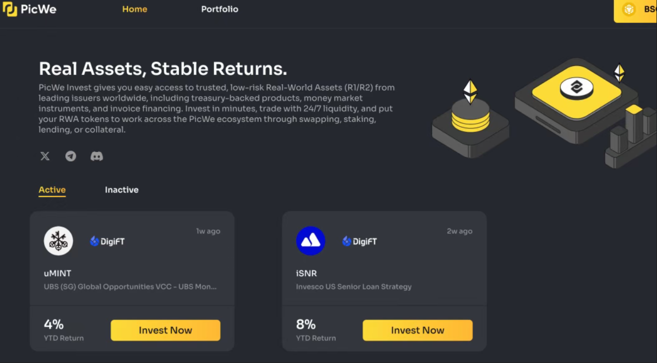 PicWe Invest 是面向全球用户的RWA低风险资产(R1/R2类型资产)分销平台。 PicWE用区块链技术重塑美债投资,带来前所未有的便利和收益: