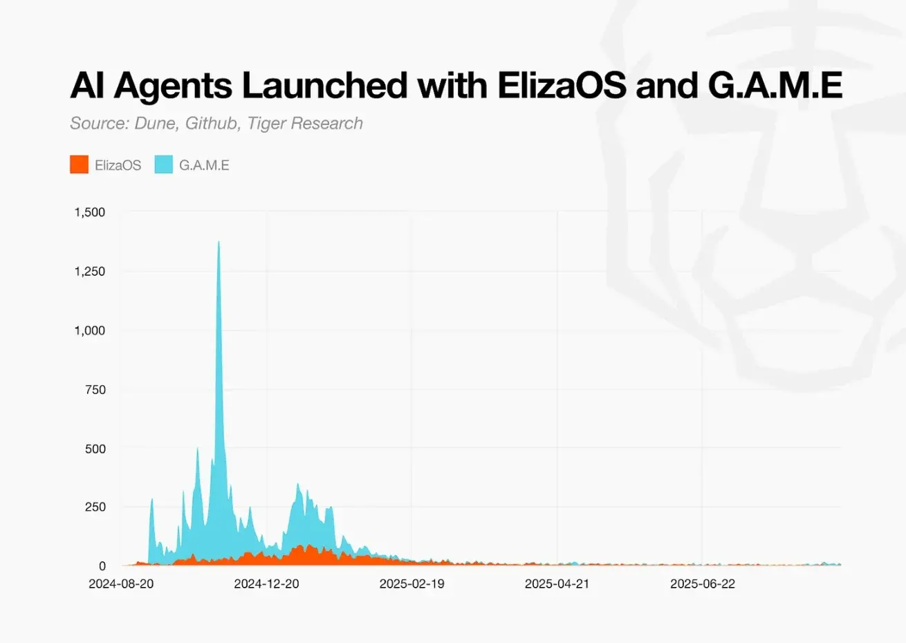 加密领域内的 AI 代理板块从 2024 年底开始受到关注。ai16z 团队的 ElizaOS 和 Virtuals Protocol 团队的 G.A.M.E 开发栈显著降低了代理开发的门槛。DAOS.fun 和 Virtuals Fun 等启动平台为将开发出的代理代币化提供了平台。从开发到发布的过程变得简化,市场兴趣爆发,大量代理项目迅速涌现。