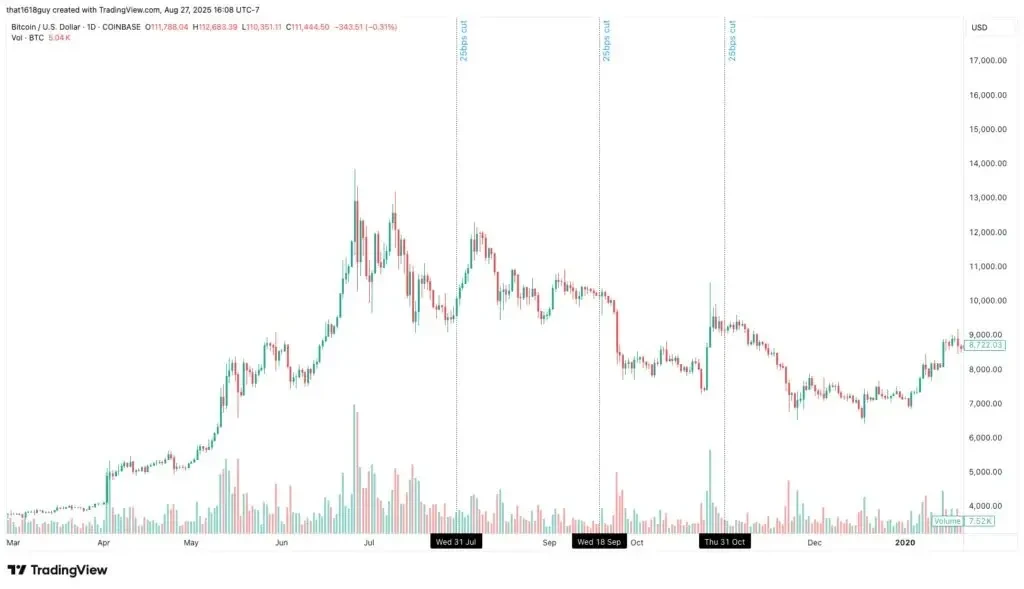 市场普遍预计美联储将在 9 月进行本轮周期的首次降息。从历史上看,比特币通常在宽松政策出台前上涨,但在降息落地后回落。然而,这一模式并非总是应验。本文将回顾 2019 年、2020 年和 2024 年的情况,以预判 2025 年 9 月可能出现的走势。