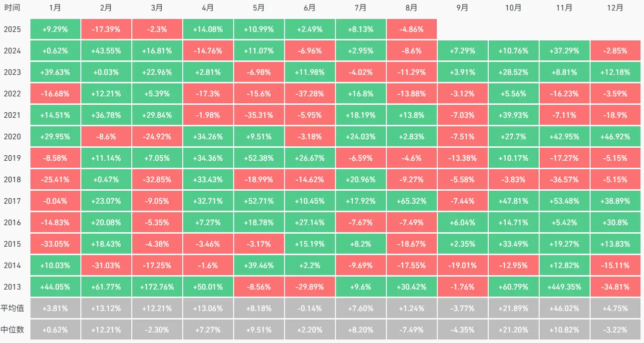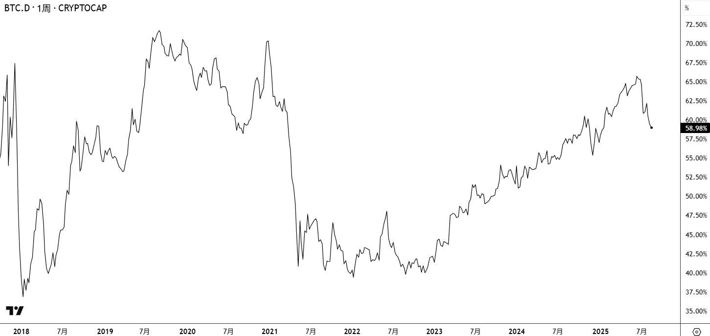 BTC.D 已从 2025 年 6 月的 66% 下降到当前约 59%,从传统四年周期的角度来说,这通常意味着牛市可能开始进入下半场。ETH 将接过接力棒,引领市场,而 2025 年 7 月至 8 月的市场整体表现正印证了这一观点。尽管本周市场略有回落,但只是中场休息,预计 ETH 在短暂休整后将延续强势表现。