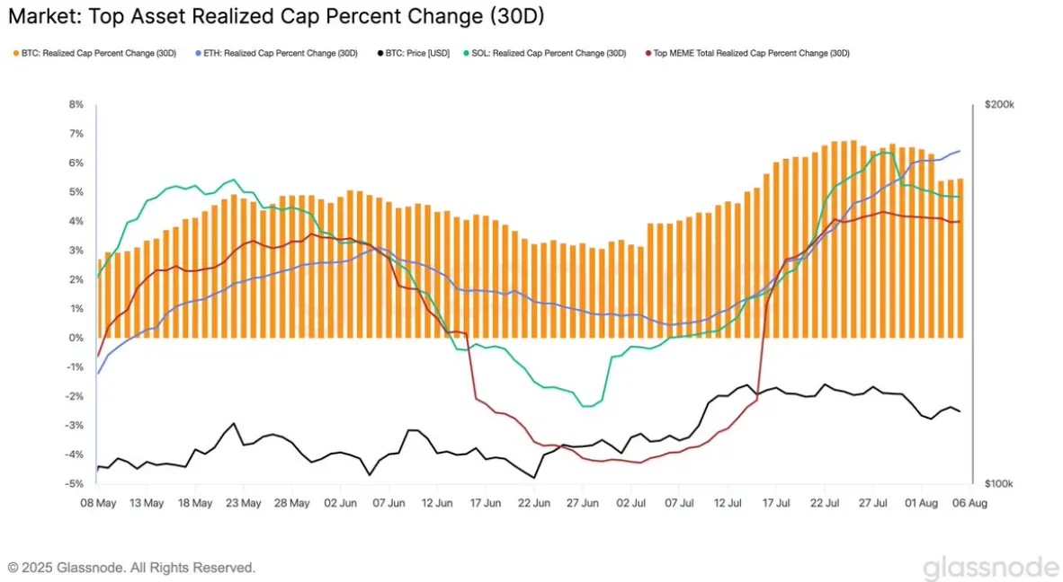 从链上资金沉淀的角度来看,ETH 的表现同样优于其他主流资产。已实现市值(Realized Cap)是衡量链上真实资本流入的重要指标,计算方式为每一枚代币按照其最后一次链上转账时的价格计价后加总。截至 8 月,ETH 的 Realized Cap 自 7 月以来保持稳定且高速的增长态势,而 BTC 与 SOL 等资产则表现为横盘或回落。这表明,资本在链上沉淀的过程正在明显向 ETH 倾斜。这不仅意味着资金流入规模更大,更重要的是,这些资金体现为“真实成本”的积累,反映出 ETH 在投资者资产配置中的地位正在系统性上升。