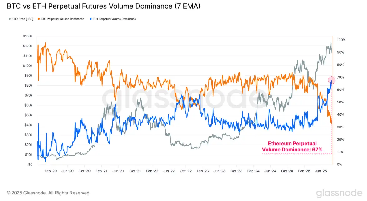 衍生品市场的结构性变化同样清晰地指向 ETH,根据Glassnode的数据,ETH永续合约交易量近期大幅上涨。ETH永续合约交易量相对于BTC的主导地位创下历史新高,当前为67%,这同时也表明市场对山寨币的投机兴趣正在升温。而另一项数据——永续合约未平仓量显示,ETH的主导率也正在快速上升并接近BTC,当前已接近45%,就整个市场而言,主要山寨币(ETH、SOL、XRP和DOGE)的未平仓合约总额最近也创下了 602 亿美元的新高,显示出市场风险偏好与资金流动正在全面转移。这意味着在资金分配层面,ETH 已成为市场风险定价和投机活动的核心标的,而 BTC 则更多扮演“价值锚”的角色。