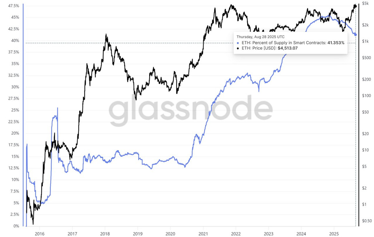 目前约41.35%的ETH已被锁定在质押、DeFi等合约中,几乎占流通量的一半。