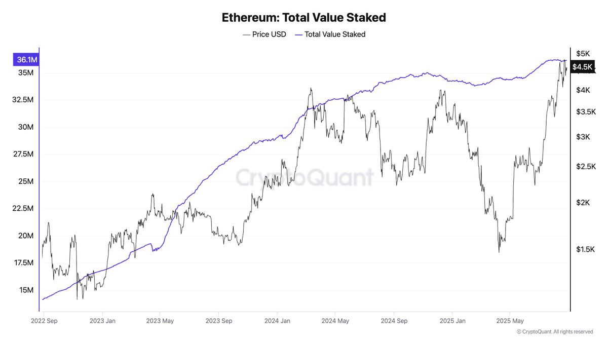 目前,已有约3613.7万枚ETH在质押中,接近目前总供应量的30.1%,质押规模屡创新高。这些锁定的ETH有效减少了流通供给,从供需层面减少了抛压。