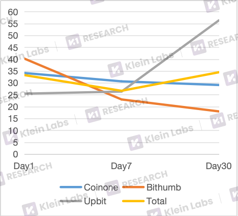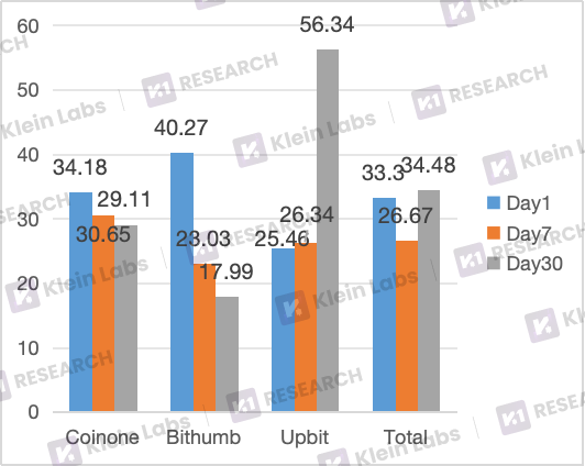 从价格表现的时间分布分析来看,Coinone 上市代币的总体收益率表现最佳。在 第 1 天、第 7 天、第 30 天 三个观察窗口中,Coinone 在两个时间节点的收益率均高于代币总体平均水平,而其余一个时间节点略低于平均值。相比之下,UPbit 与 Bithumb 仅在一个时间节点表现优于平均值,其余时间段均落后于市场整体水平。