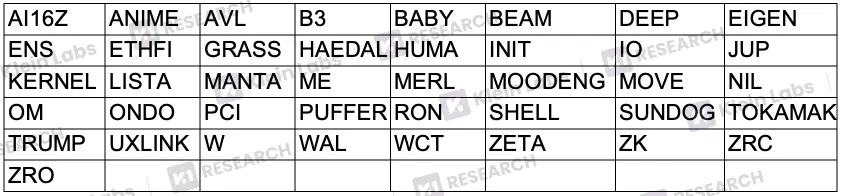 ● 在 DeFi 赛道中,三家交易平台共同上线的大型海外优质项目共有 BABY、COW、DEEP、DRIFT、ENA、HAEDAL、JTO、JUP、KERNEL、PUFFER、W、ZRO 这 12 个标的,均为在全球范围内具有较高知名度与用户基础的代表性项目,显示出交易平台在高质量 DeFi 资产选择上的趋同性。