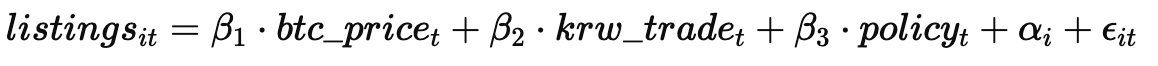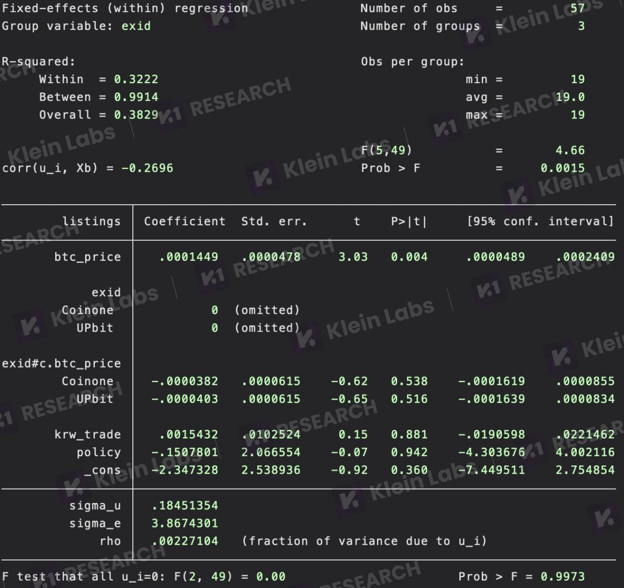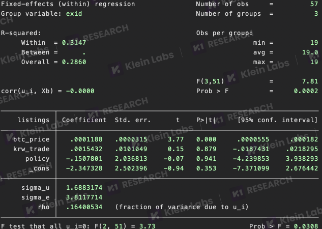 本部分采用面板数据固定效应回归模型,旨在系统评估 BTC 价格、韩元计价交易量及政策因素对韩国主要交易平台上币数量的影响。