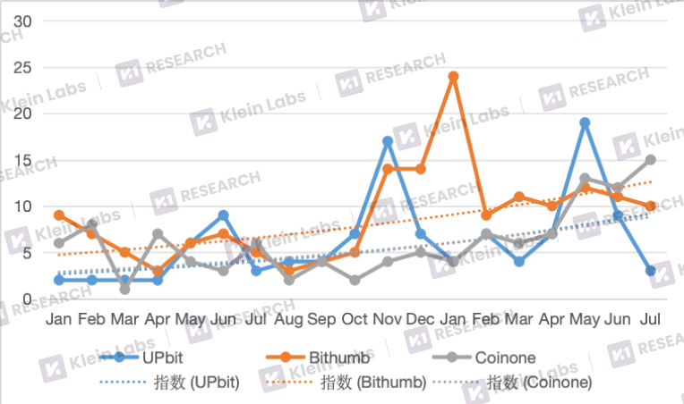 ● 前三大交易平台之中的 UPbit 和 Coinone,上币数量则基本持平。呈现出更加稳健和审慎的上币策略,侧重于维持现有生态稳定和合规性要求。