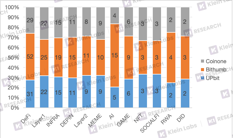 ● Bithumb 在统计期间上币数量位居首位,且与 UPbit、Coinone 相比,其新增代币中在 DeFi 与 AI 赛道的比重更高,充分体现了 Bithumb 在 2024 年 AI 热潮中对市场机会与热点的敏锐捕捉,以及在上币策略上的快速响应。