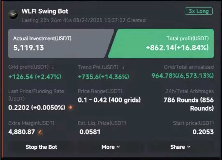 除了直接持有,我还在Pionex上运行一个$WLFI交易机器人。网格区间设定在0.10至0.42美元。在22小时内,它已经为我带来了2.5%的利润(年化收益率高达960%)。对不愿长期持有的投资者而言,仅靠波动性也能捕捉到可观收益。