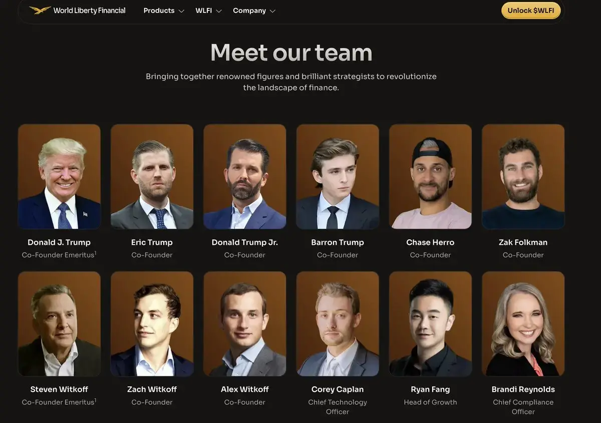 $WLFI是特朗普的官方代币,其背后联合创始人包括Eric Trump、Donald Trump Jr.以及Barron Trump。特朗普本人在就任总统之前也已被列入团队。这一项目并非简单的memecoin,而是与受监管的稳定币USD1紧密挂钩。USD1由美国国债支持,使得$WLFI兼具政治工具与金融属性。
