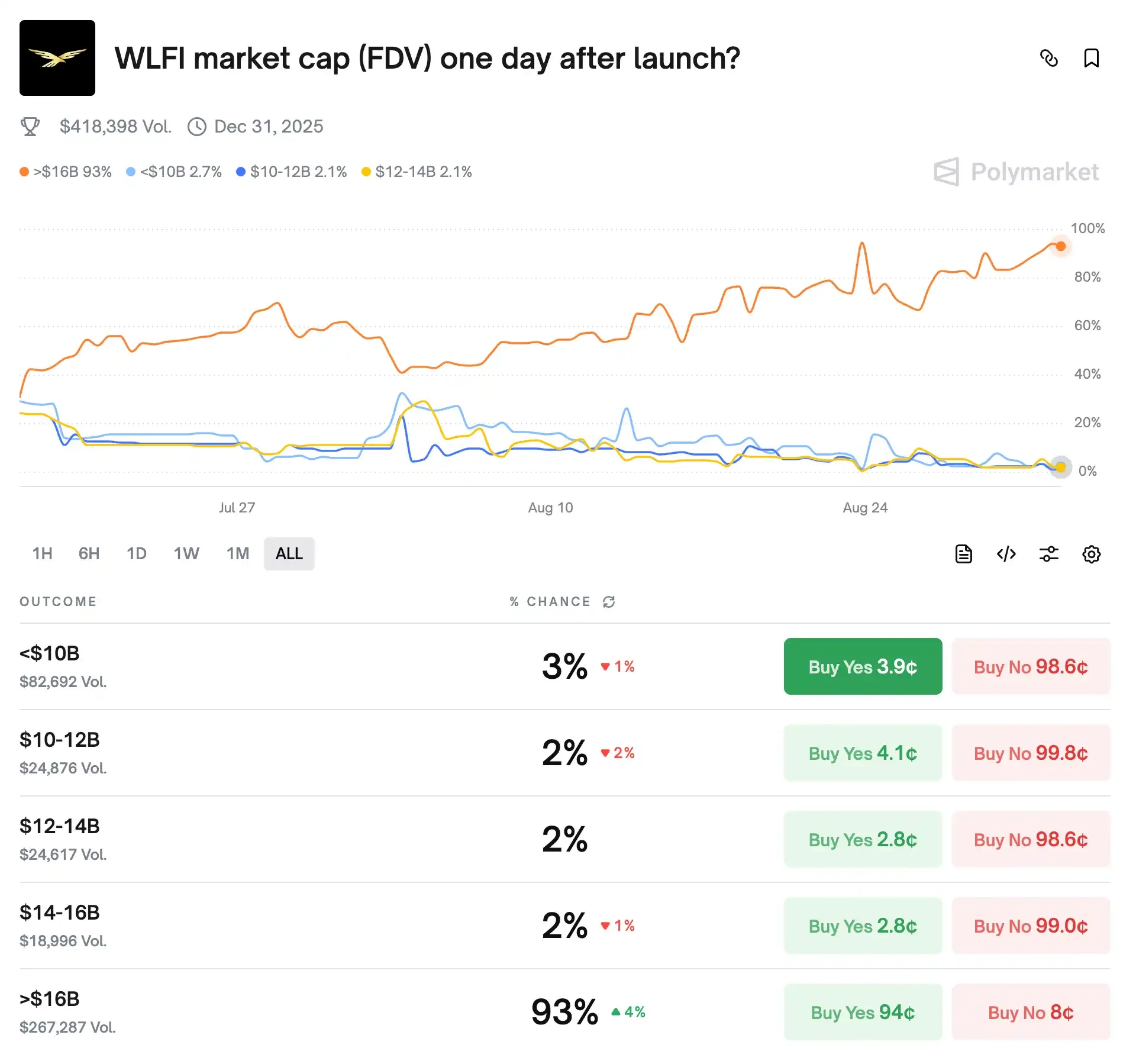 因为问的都是「WLFI 上线一天后的 FDV」,它们的价格必须彼此一致:分档里的五档概率之和应当等于 100%。因此分档里的「>$16 B」那档价格,必须与阈值里的 P(>16 B) 一致。