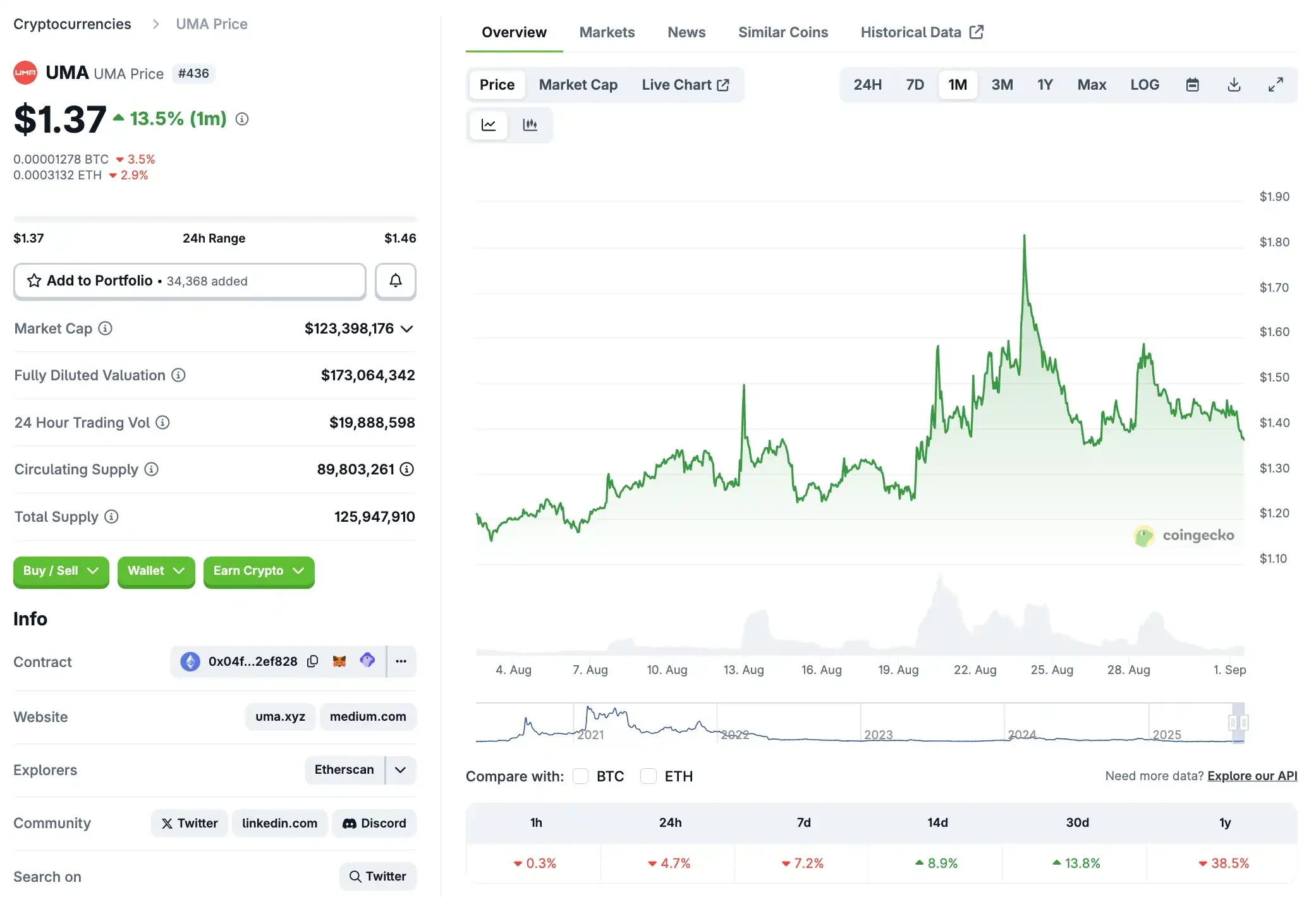 截至 2025 年 9 月 1 日,$UMA 价格为 1.38 美元,市值约 1.238 亿美元,14 日涨幅 8.9%,30 日内涨幅 13.8%,显示出积极的短期表现。该代币于 2021 年 2 月 4 日创下 41.56 美元的历史高点,当前价格较峰值下跌 96.7%,但近期走势相对稳定。