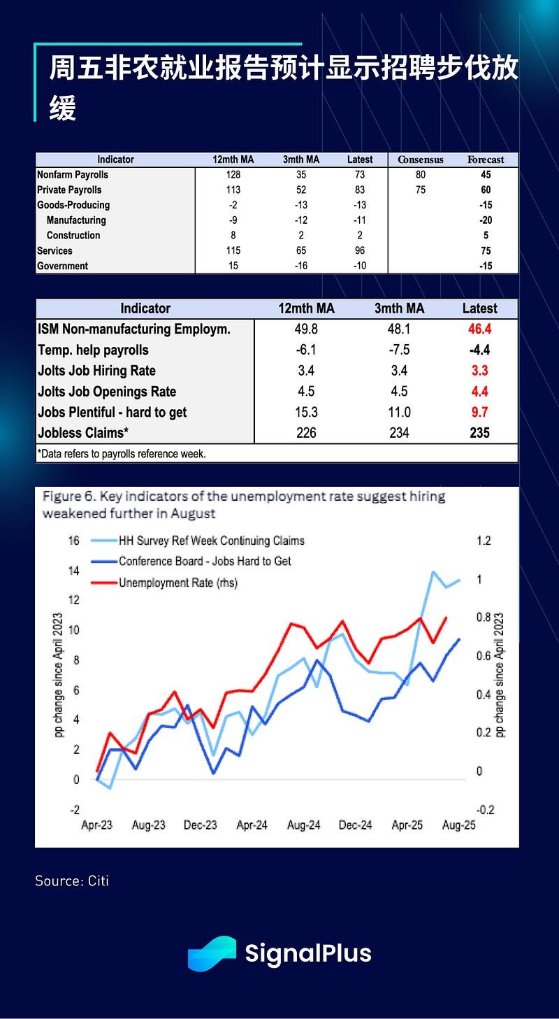 本周焦点将是周五的非农就业报告(NFP),市场预计总体就业人数将增加约 4.5 万(私营部门增加 6 万),失业率为 4.3%。鉴于招聘需求疲软,就业增长放缓的趋势预计将持续,每月约 5 万的新增就业人数反映了经济放缓和移民减少的现实。