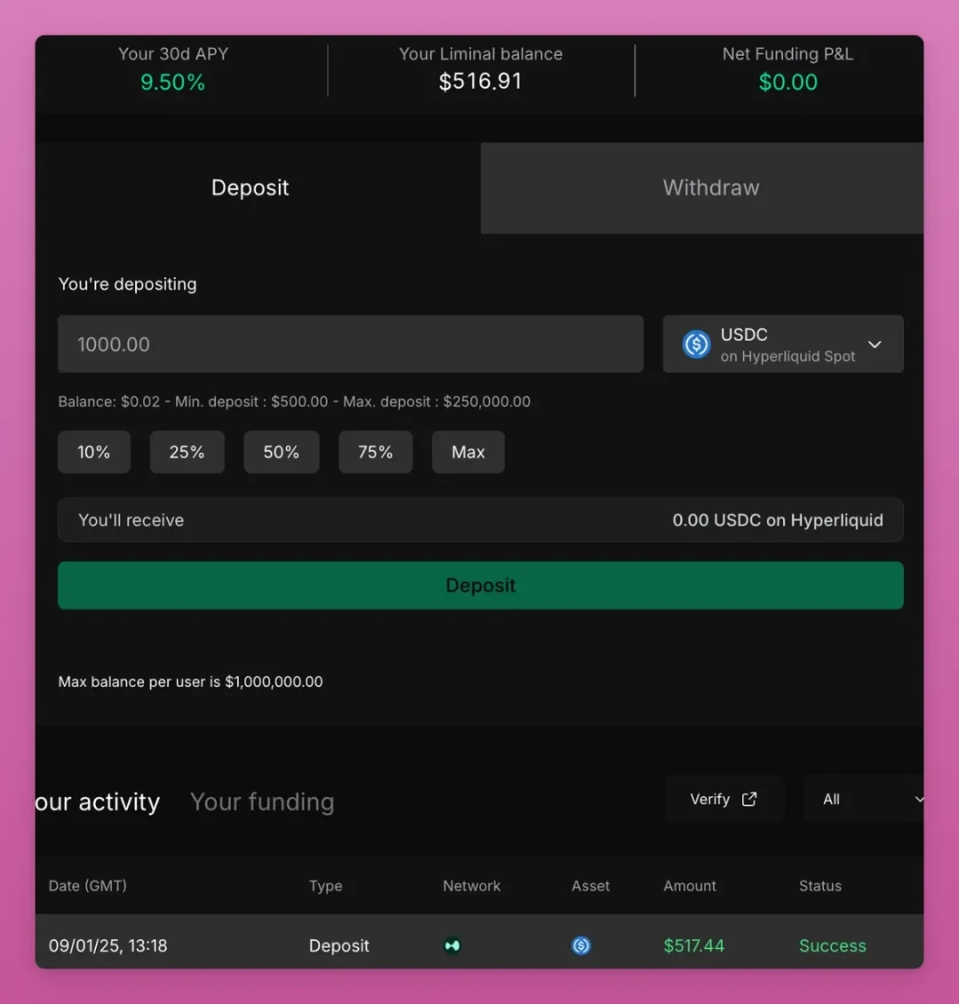 存入 USDC,通过资金费率差和保持市场中性头寸来赚取收益。