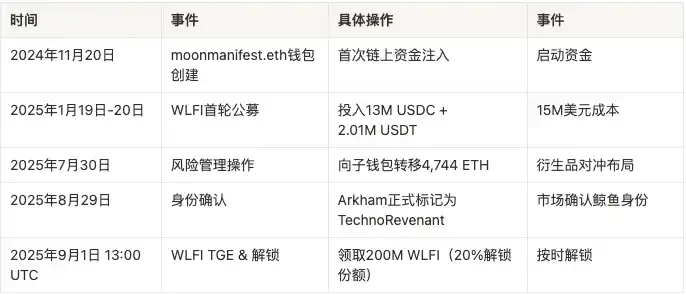 TechnoRevenant 早在 2025 年 1 月 就开始布局 World Liberty Financial 项目,彼时特朗普还未正式上任美国总统,而官网的「Gold Paper」也写着 WLFI 无法转移。但 TechnoRevenant 还是通过 moonmanifest.eth 这个钱包投入了 1300 万 USDC 和 201 万 USDT,总计约 1500 万美元参与 WLFI 首轮公募购买了约总供应量 1.5% 的份额。