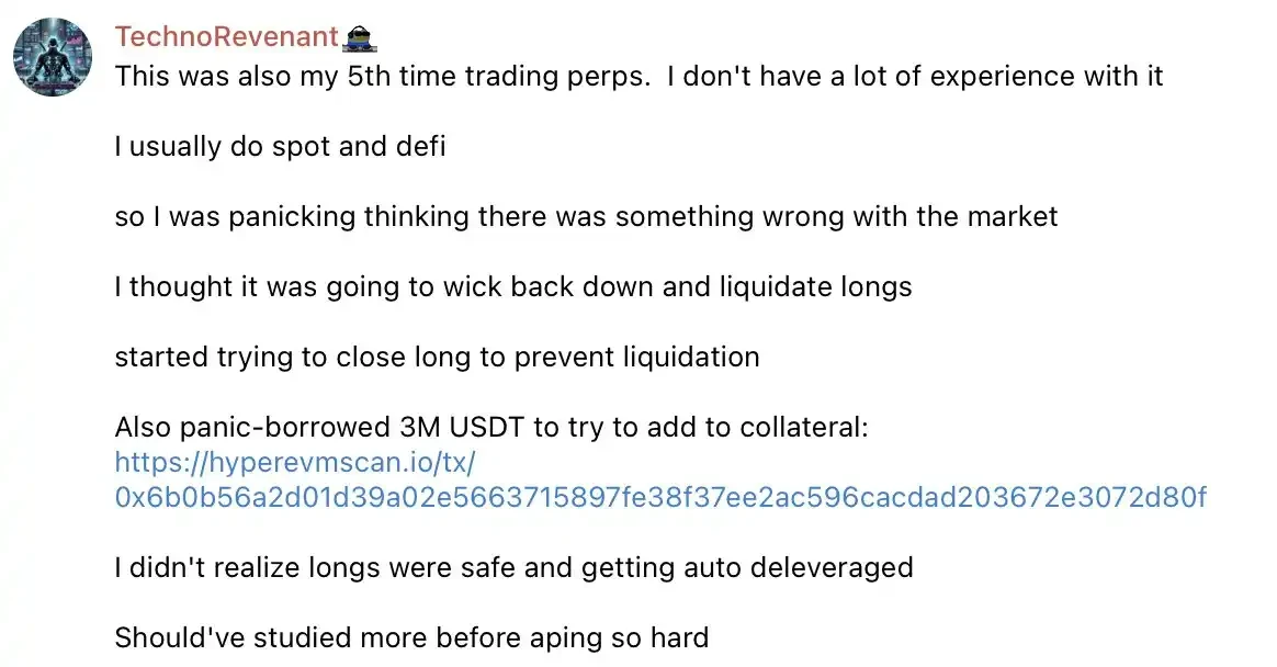 等他意识到问题时,市场开始小幅回落。他甚至紧张的借了 300 万美元以防不测,他尝试关闭做多头存,但没意识到自己的持仓量之多让他的做多仓位是安全的,hyperliquid 在此期间启动了自动减仓的机制,在接下来的 15 分钟内他依旧以单次 4.5 万美元的体量持续买入,而后开始逐渐关闭自己的多单。