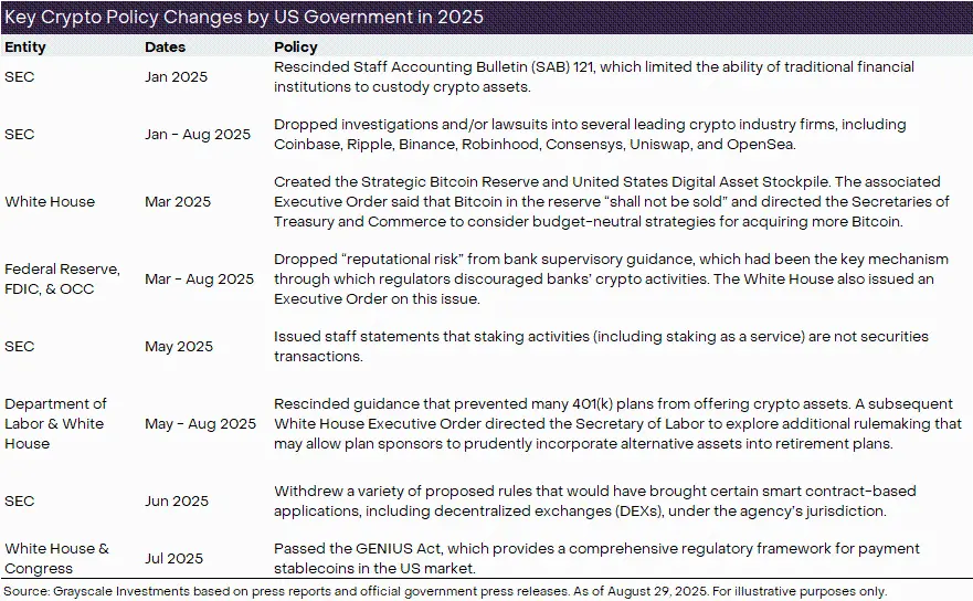 然而,今年美国的政策变化不仅限于稳定币,还涵盖了从加密资产托管到银行监管指导的一系列议题。展望未来,这些政策变化可能进一步推动机构投资者进入加密行业。根据我们的观察,特朗普政府及联邦机构在数字资产领域采取的最重要政策行动已在图 2 中总结。这些政策变化,以及未来可能出台的更多政策,正在引发加密行业的机构投资浪潮(更多详情请参阅 《2025 年 3 月:机构连锁反应》 )。