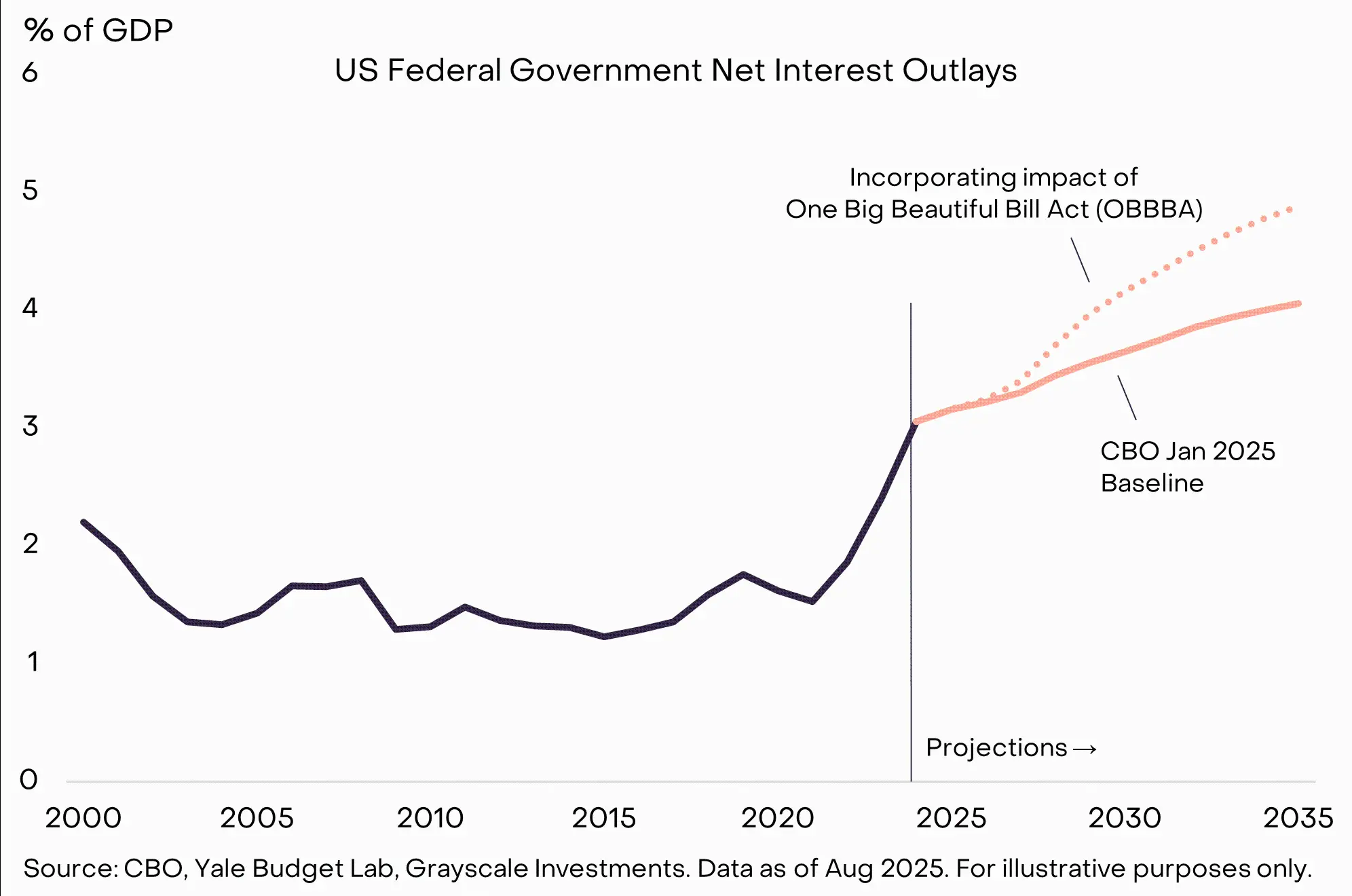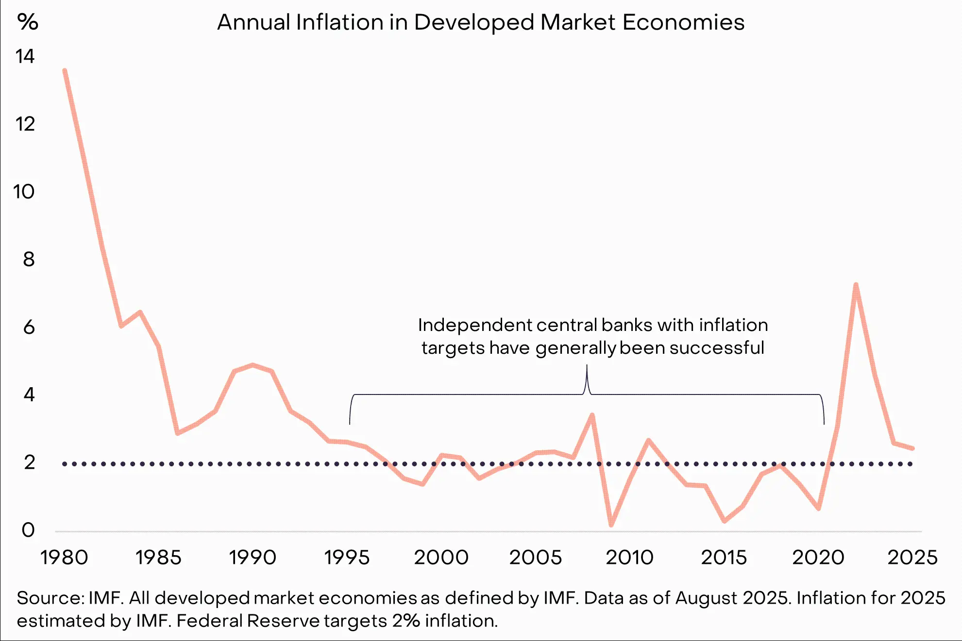 今年 7 月通过的《大而美法案》(One Big Beautiful Bill Act,OBBBA)将锁定未来 10 年的高赤字。除非利率下降,否则这将意味着更高的利息支出,并进一步挤压政府收入的其他用途。结果是,白宫多次施压美联储降低利率,并要求美联储主席鲍威尔辞职。8 月份,随着美联储七人理事会六名现任成员之一丽莎·库克被罢免,这些对美联储独立性的威胁进一步升级。 [11] 虽然短期内可能对民选官员有利,但美联储独立性的削弱在长期内会增加高通胀和货币疲软的风险。